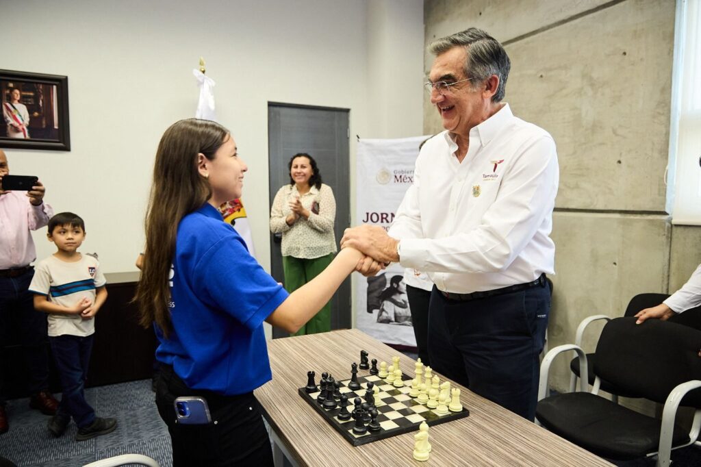 Como parte de la Jornada de Ajedrez por la Paz, y ante la presencia de las y los integrantes de la Mesa de Coordinación para la Construcción de Paz, el gobernador sostuvo una partida con Daniela Ordoñez Alarcón, de Altamira, quien recientemente logró coronarse campeona nacional de ajedrez en Querétaro, y representará a México en el Campeonato Panamericano, a celebrarse en Canadá.