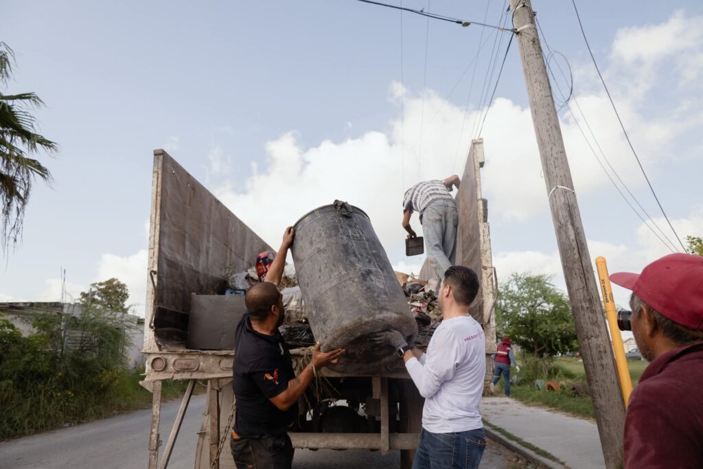 H. Matamoros, Tamaulipas.- Con el firme compromiso de garantizar espacios más saludables para las familias matamorenses, el alcalde Beto Granados encabezó jornada del programa de Descacharrización en las colonias Santa Elena, Obrera y San Rafael. Esta actividad, realizada en coordinación con la Secretaría de Bienestar Social, forma parte de las acciones que impulsan el renacimiento de Matamoros mediante la limpieza de calles, eliminación de criaderos y la protección del entorno familiar.