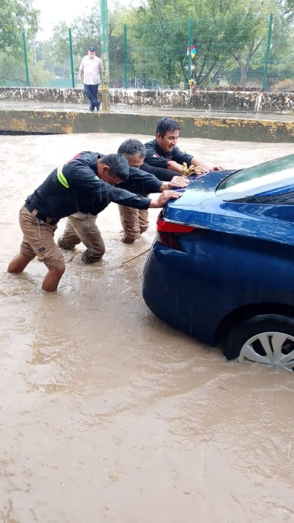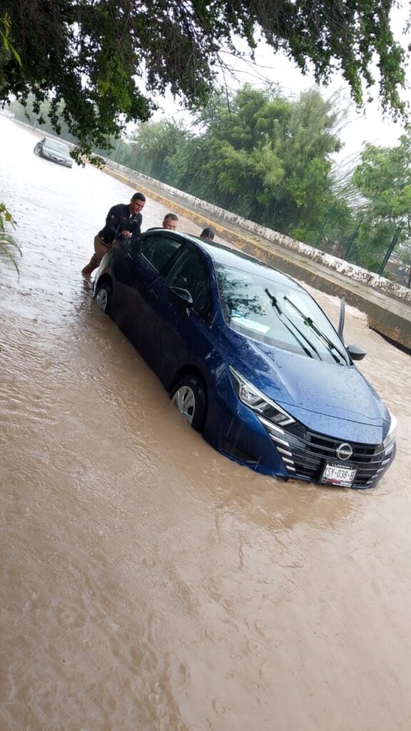Lo mismo ocurrió en la calle Conrado Castillo con eje vial, donde se registró peligroso encharcamiento, mientras que en el paso a desnivel del 23 y 24 Juárez, agentes viales rescataron a una dama que había quedado varada a bordo de su automóvil. Minutos después la unidad motriz también fue retirada por agentes viales.
