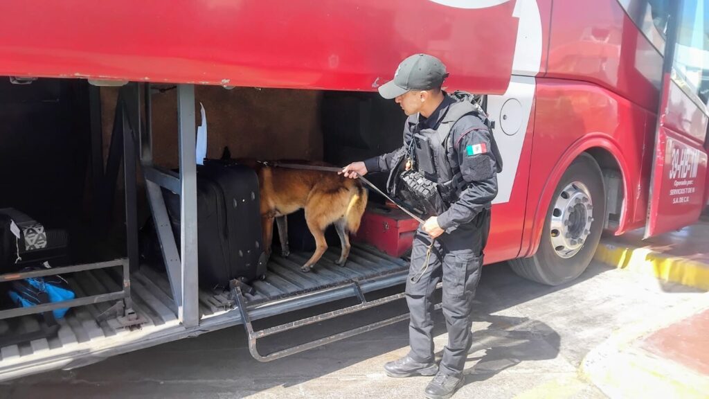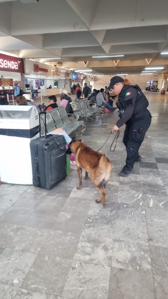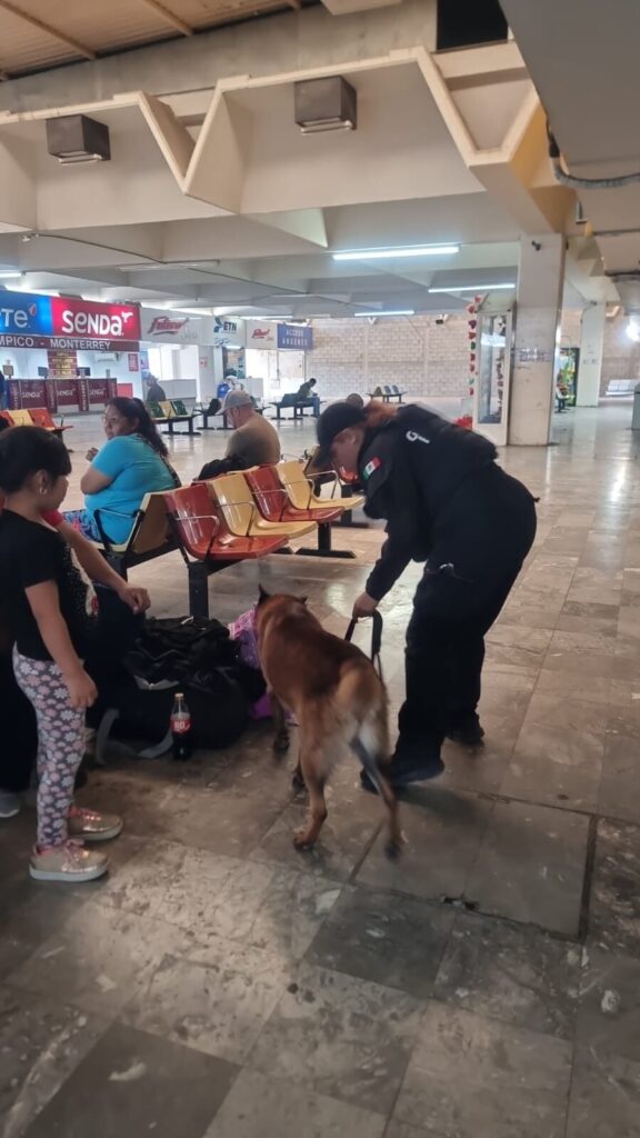 Ciudad Victoria, Tamaulipas.- Como parte de los operativos permanentes de seguridad implementados en Centrales de Autobuses, personal del Agrupamiento Canino de la Guardia Estatal en Ciudad Victoria realizó una inspección en este punto de acceso y salida a la capital tamaulipeca.