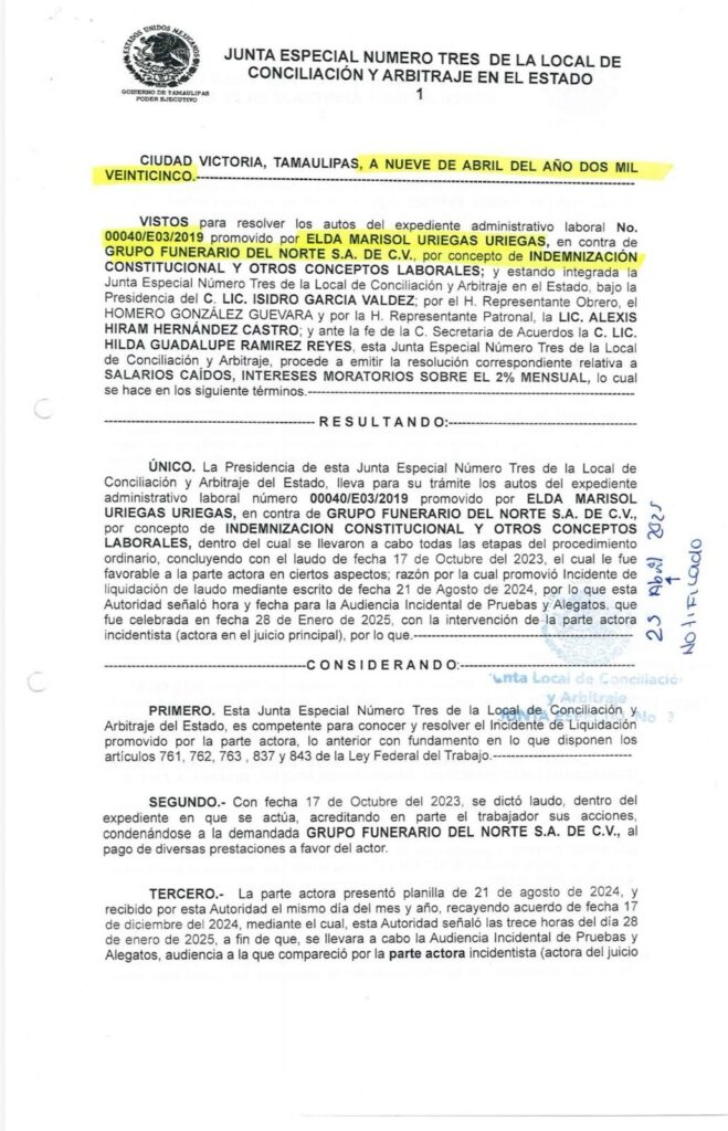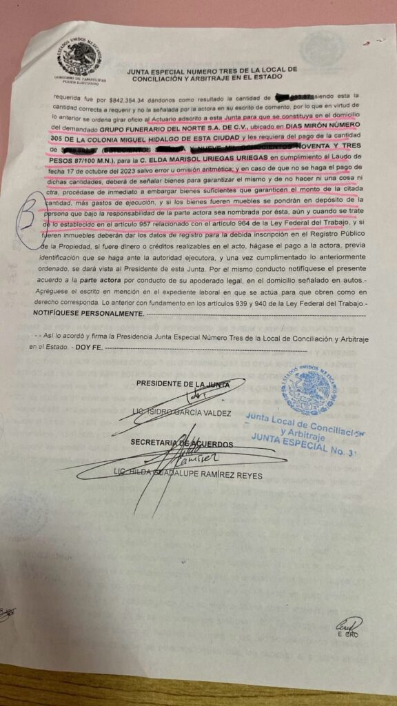 Ciudad Victoria, Tamaulipas. – Este jueves, la Junta Especial Número 3 de Conciliación y Arbitraje ejecutó un embargo de bienes en contra de la empresa Funerales del Refugio, filial del Grupo Funerario del Norte, luego de que la compañía incumpliera el pago de un laudo laboral a favor de Marisol Uriegas, trabajadora de la firma.