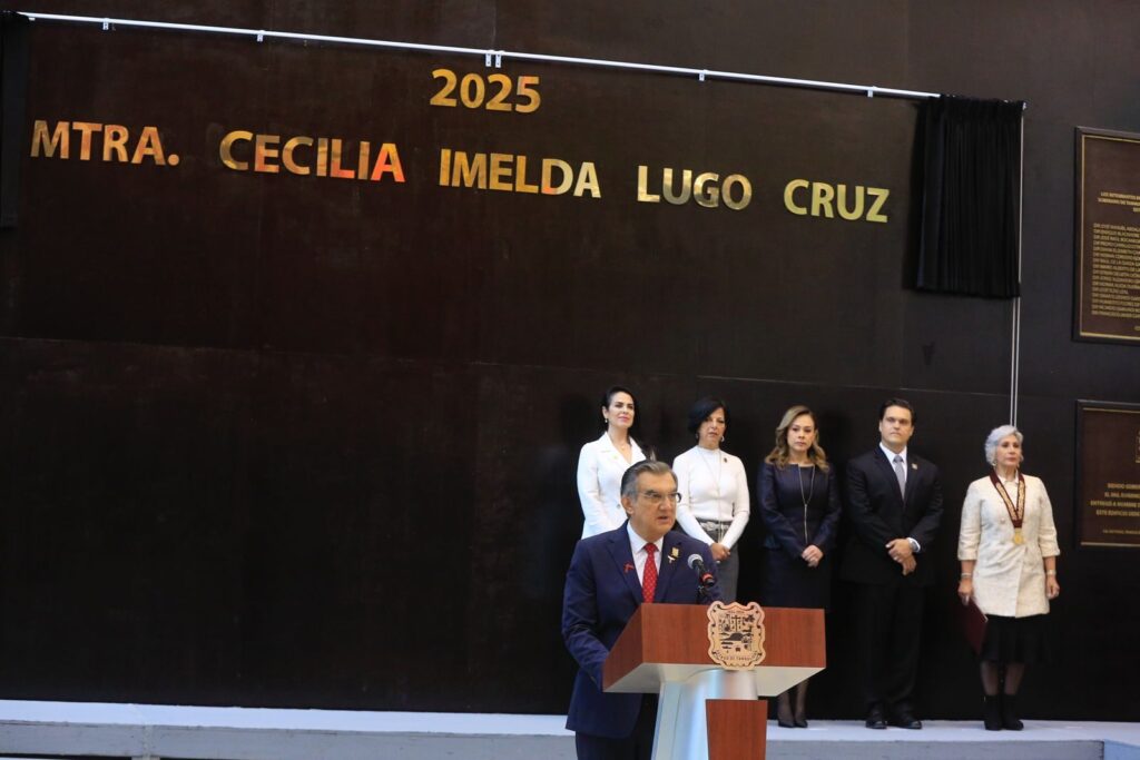 Ciudad Victoria, Tamaulipas.– El gobernador Américo Villarreal Anaya entregó la Medalla al Mérito «Luis García de Arellano» a la maestra tampiqueña Cecilia Imelda Lugo Cruz y develó su nombre con letras doradas en el Muro de Honor del Congreso del Estado, como un justo reconocimiento por su trayectoria profesional y ejemplar en la danza, la literatura, el teatro y la poesía, además de ser una destacada bailarina coreógrafa, gestora cultural, y una figura emblemática de la escena dancística nacional.