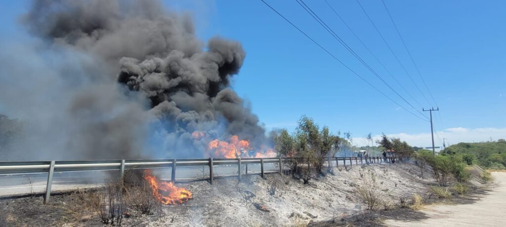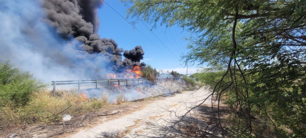 Mainero, Tamaulipas.- Derivado de la volcadura y explosión del segundo remolque de una pipa a la altura del kilómetro 126 la circulación se encuentra cerrada en la Carretera Federal 85 Victoria-Monterrey.