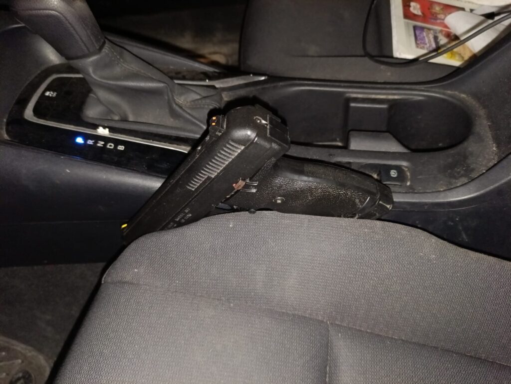 Al realizar una inspección al interior del automóvil, se localizó y aseguró un arma corta calibre .40, así como seis dispositivos de radiocomunicación de diversas marcas.