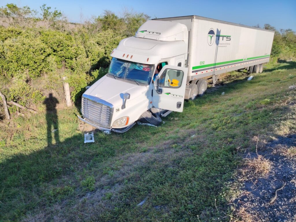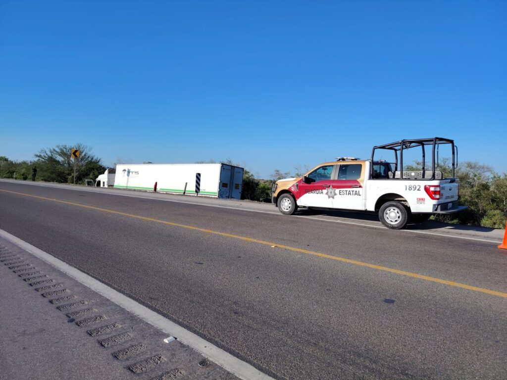 González, Tamaulipas.- Como parte de las acciones de vigilancia en las vías de comunicación de Tamaulipas, personal de la Guardia Estatal de Apoyo Carretero comisionado a la Estación Segura Villa Manuel acudieron al kilómetro tres de la Carretera Federal 80 Manuel-González para brindar seguridad ante el derrape de un tractocamión.