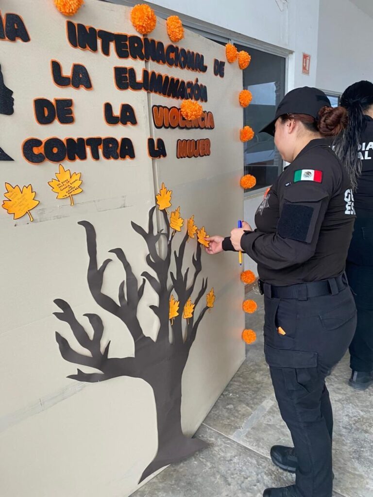 Entre estas actividades, se incluyó la colocación de frases de respeto, motivación y sororidad en un mural elaborado por el personal operativo y administrativo, además, se colocaron listones naranjas en el brazo izquierdo como muestra del compromiso ético y la reflexión colectiva.