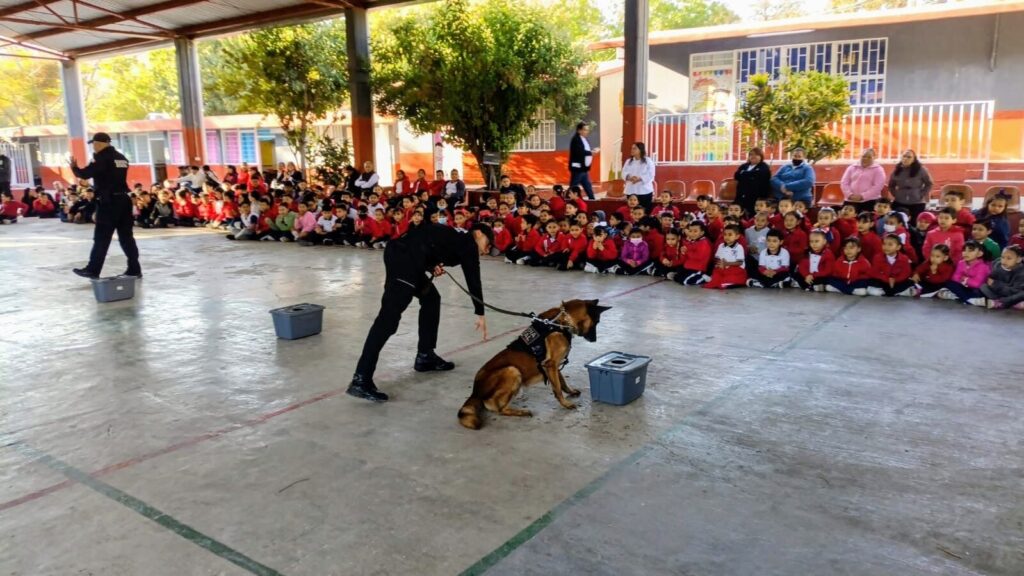 Ciudad Victoria, Tamaulipas.- Con el objetivo de fortalecer la cultura de la prevención desde edades tempranas, la Dirección de Agrupamientos Policiales, a través del Agrupamiento Canino, realizó una jornada cultural para prevención y auxilio en la Escuela Primaria Matías S. Canales, ubicada en la colonia Tamatán de Ciudad Victoria.