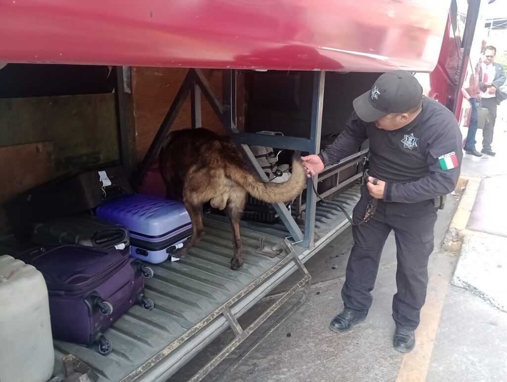 Como parte de las acciones de vigilancia, el binomio canino inspeccionó maletas pertenecientes a viajeros, además de revisar autobuses sin mostrar cambios en su comportamiento que indicaran la posible presencia de sustancias prohibidas.