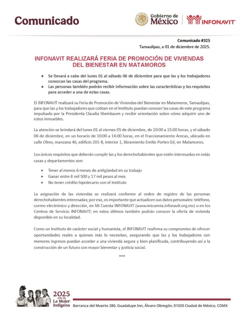 El INFONAVIT realizará su Feria de Promoción de Viviendas del Bienestar en Matamoros, Tamaulipas, para que las y los trabajadores que cotizan en el Instituto puedan conocer las casas de este programa impulsado por la Presidenta Claudia Sheinbaum y recibir orientación sobre cómo adquirir uno de estos inmuebles.
