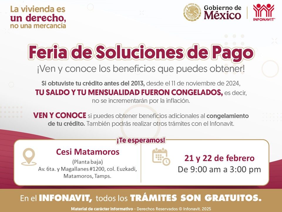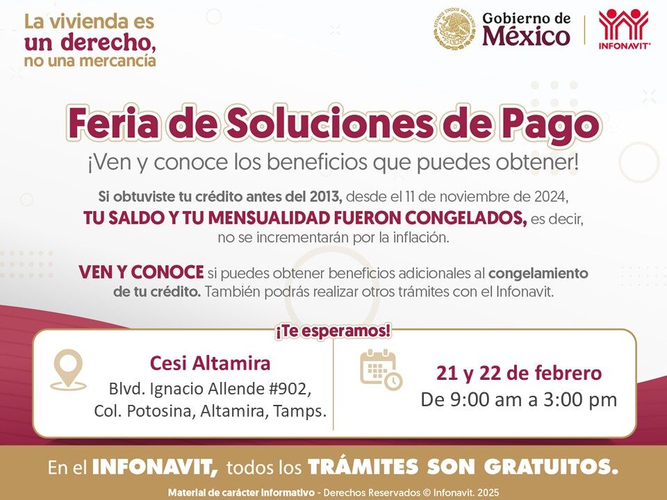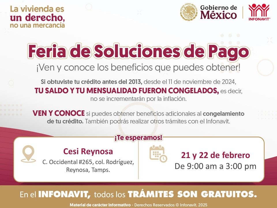 Tamaulipas, a 20 de febrero de 2025.- El Instituto del Fondo Nacional de la Vivienda para los Trabajadores (INFONAVIT) realizará Ferias de Cartera en Tamaulipas, con el objetivo de acercar sus soluciones de pago a las personas derechohabientes.