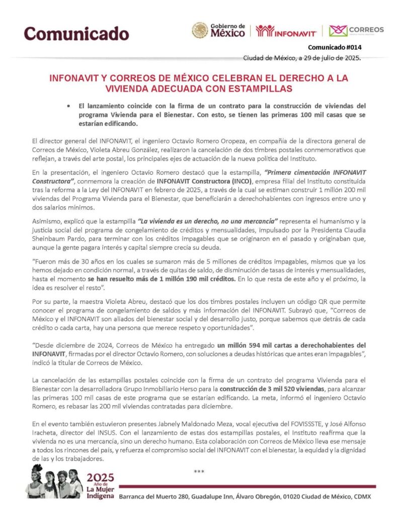 La cancelación de las estampillas postales coincide con la firma de un contrato del programa Vivienda para el Bienestar con la desarrolladora Grupo Inmobiliario Herso para la construcción de 3 mil 520 viviendas, para alcanzar las primeras 100 mil casas de este programa que se estarían edificando. La meta, informó el ingeniero Octavio Romero, es rebasar las 200 mil viviendas contratadas para diciembre.