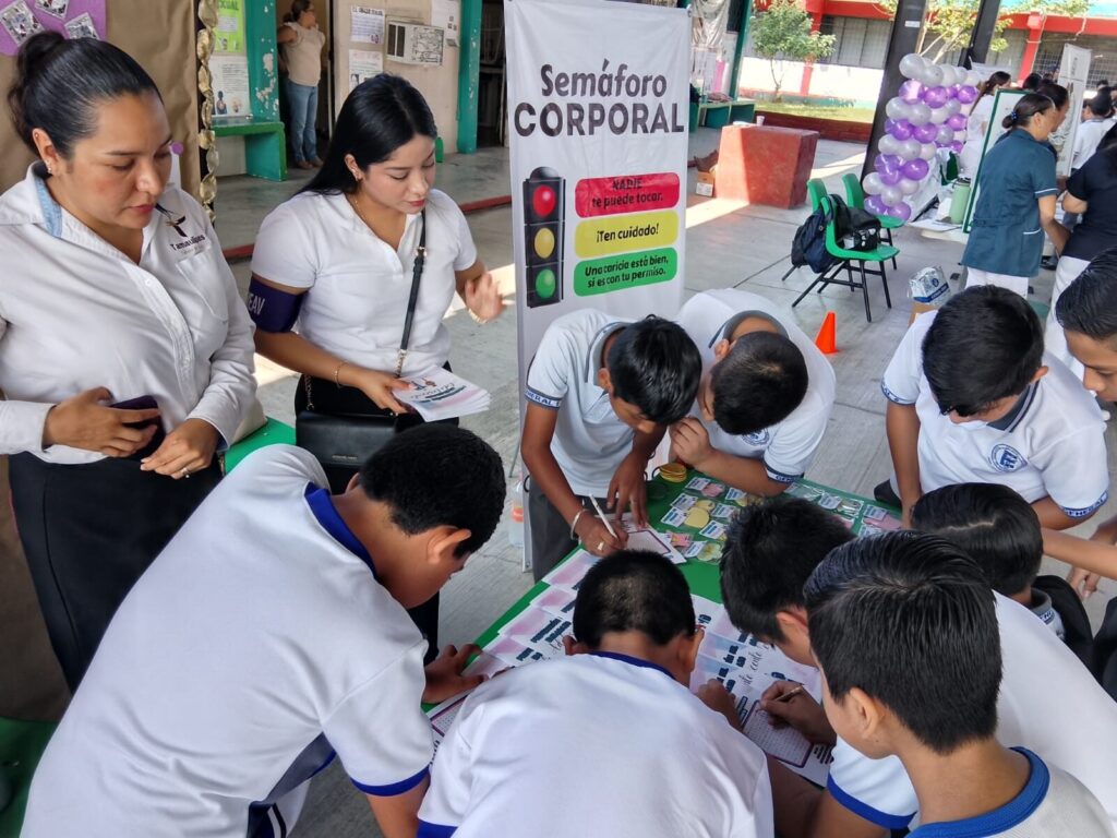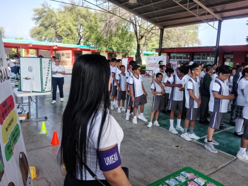 Esta actividad estuvo dirigida a estudiantes de la Escuela Secundaria General Número Cinco ‘’Profesor Juventino Pineda y Ortega’’ y abordó temas relativos a la salud sexual y reproductiva como los métodos anticonceptivos, la Cartilla de los Derechos a la Protección de Salud y Seguridad Social así como la dinámica ‘’semáforo corporal’’ para prevenir violencia sexual.