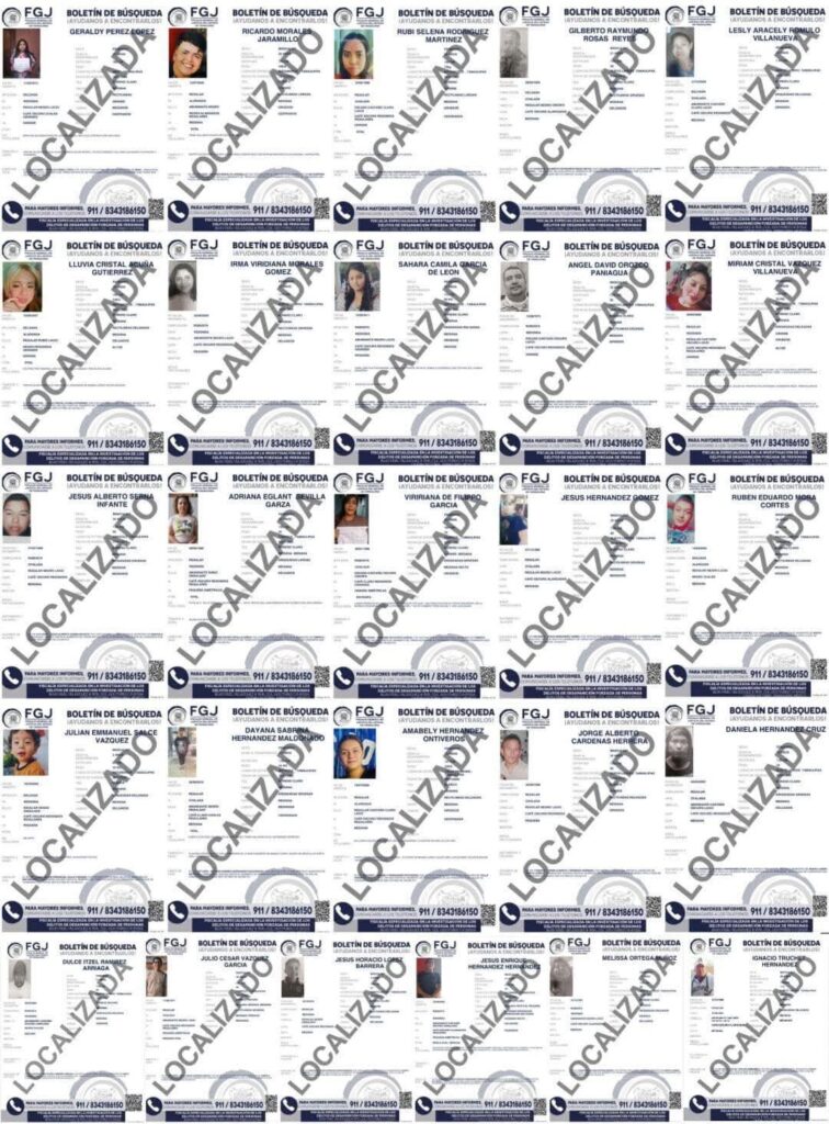La Fiscalía General de Justicia del Estado confirma que del 11-16 de noviembre, 26 personas fueron localizadas con vida en Tamaulipas, derivado de los trabajos interinstitucionales de búsqueda e investigación, se logró determinar que su ausencia fue voluntaria y se encuentran atendidas por las corporaciones correspondientes.