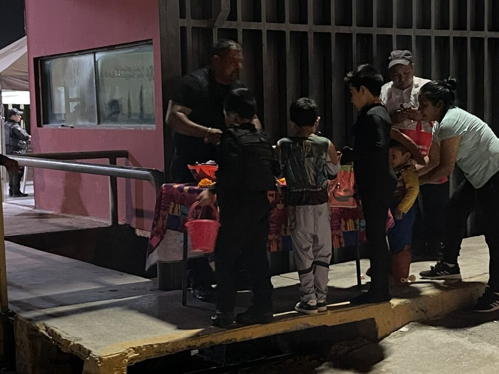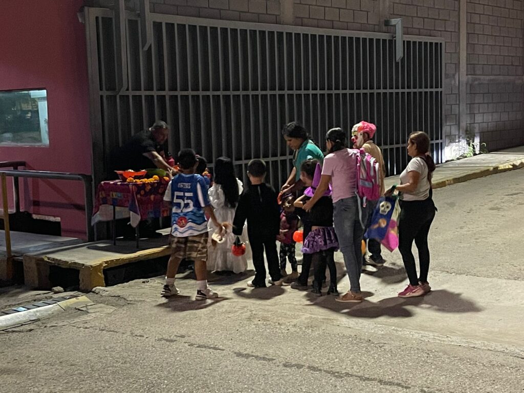 Elementos de la Guardia Estatal se sumaron a la actividad de entregar golosinas a niños, niñas y adolescentes que llegaron esta noche a las instalaciones del Complejo de Seguridad Pública a pedir su calaverita.