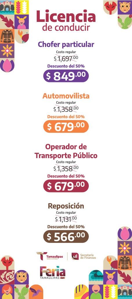 Ciudad Victoria, Tamaulipas.- Con el propósito de apoyar la economía de las y los tamaulipecos, así como de promover la regularización de trámites vehiculares, el Gobierno del Estado de Tamaulipas, a través de la Secretaría de Finanzas, pone a disposición de la ciudadanía descuentos especiales en la expedición y reposición de licencias de conducir durante la Feria Tamaulipas 2025.