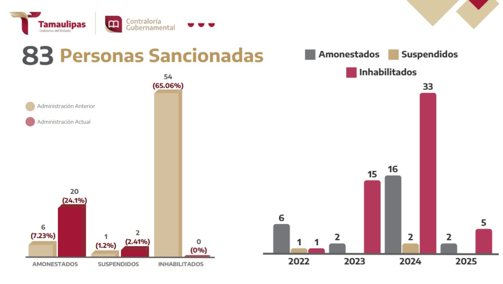 En conferencia de prensa, señaló que, a la fecha, esta dependencia ha emitido 83 sanciones a exfuncionarios y personas servidoras públicas del Gobierno del Estado de Tamaulipas. De ellas, 26 corresponden a amonestaciones, tres a suspensiones y 54 a inhabilitaciones. Mientras que 21 personas reciben la sanción de inhabilitación por parte de la Contraloría Gubernamental por haber presentado conductas clasificadas en desapego a la normatividad que todo servidor público debe observar en su marco de actuación y bajo el principio de legalidad.