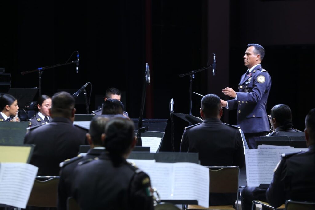 En la segunda parte del concierto se realizó una fusión única con la Orquesta Sinfónica de la Universidad Autónoma de Tamaulipas y la Banda de Guerra Monumental de la Coordinación Territorial Región Golfo de la GN.