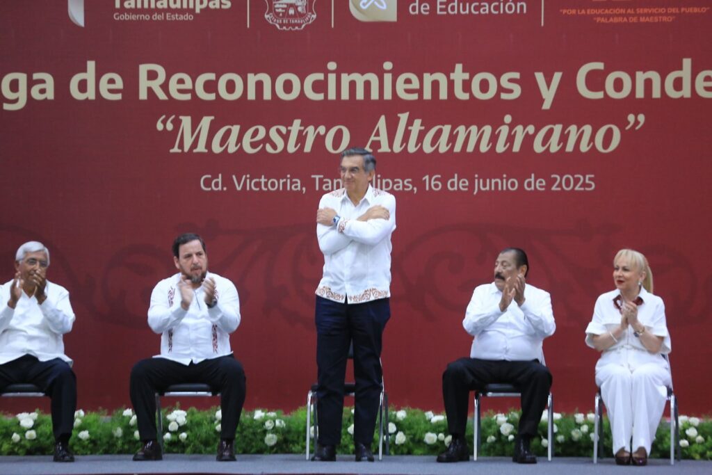 Y agregó: “Su amigo, el gobernador del Estado, seguirá este ejemplo en dicha alianza con las y los maestros de Tamaulipas, y me llena de orgullo que la fuerte herencia docente que hay en mi familia esté hoy también reconocida, por lo que seguiremos juntos en este camino de mejora continua, para ser actores preponderantes en la transformación de nuestra sociedad, que incluyen avances digitales, cambios en los planes y programas educativos, así como la inclusión de iniciativas escolares propuestas por nuestra presidenta Claudia Sheinbaum Pardo”.