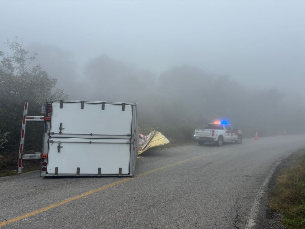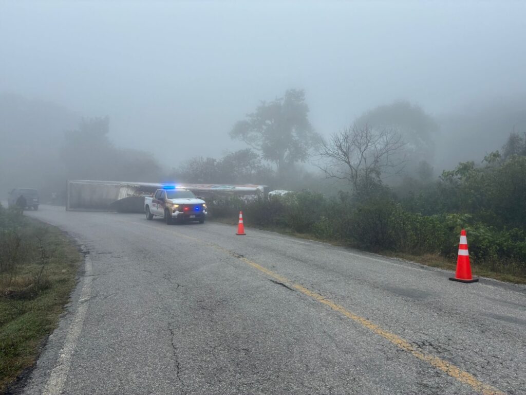 Personal de Tránsito Estatal atendió el reporte, donde se confirmó la volcadura de un tractocamión Kenworth, acoplado a un semirremolque.