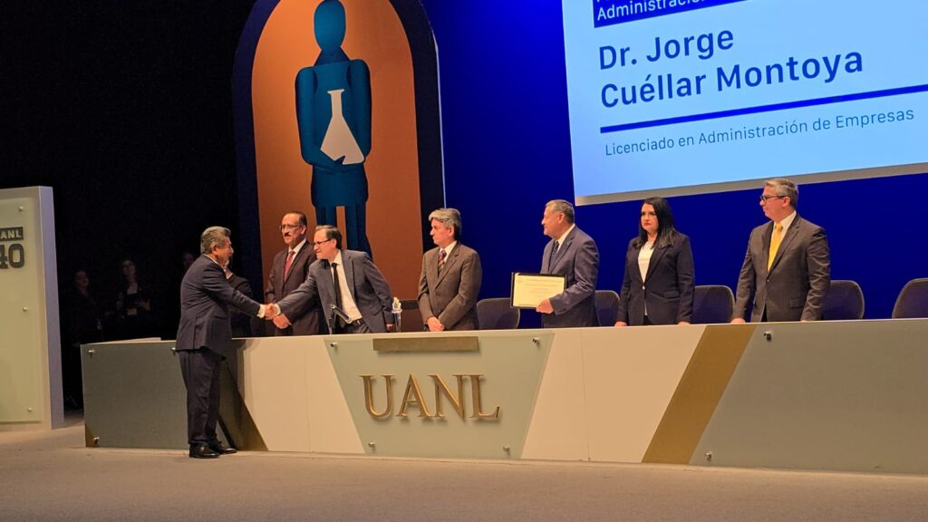 Durante la ceremonia, realizada en el Teatro Universitario de la UANL, Jorge Cuéllar Montoya recibió el galardón de manos del rector Santos Guzmán López, tras ser propuesto por la Facultad de Contaduría Pública y Administración, dentro del programa educativo de Licenciatura en Administración de Empresas, de donde egresó en 1982.