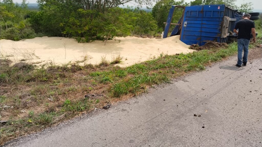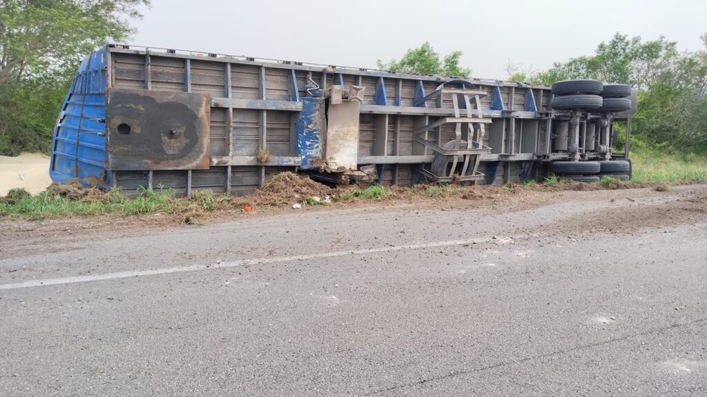 Durante recorridos de seguridad y vigilancia detectaron un camión volcado que transportaba maíz blanco.